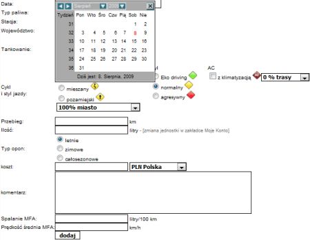 Data - definiujemy datę tankowania wybierając ją z kalendarza.