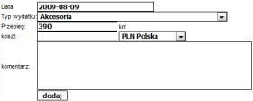 przebieg - aktualny przebieg pojazdu. Jeśli nie jest znany to mozna podac 0, wtedy przebieg zostanie uzupelniony przy pierwszym tankowaniu. Należy pamiętać, że ustawienie przebiegu sprawi, że nie będzie można wstawic notki z przebiegiem wcześniejszym, niż zadeklarowany w tym miejscu. Gdy chcemy wprowadzić dane historyczne, najlepiej wpisac 0. Przebieg zostanie uzupełniony przy wprowadzaniu tych danych.