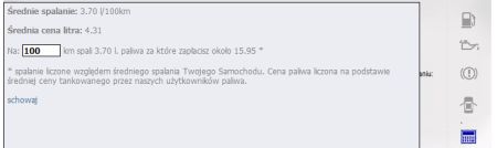 Kalkulator, który pojawia się po kilku tankowaniach oblicza, ile wydamy na paliwo, biorąc pod uwagę bieżącą średnią cenę tego paliwa oraz spalanie średnie pojazdu. Cena wyliczana jest ze średniej ceny litra paliwa zanotowanej przez naszych użytkowników.