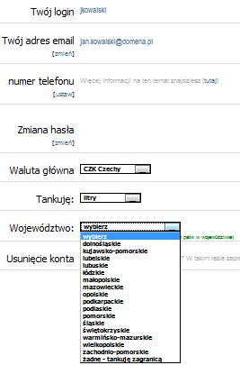 Województwo - informacja o tym, z jakiego wojewodztwa pochodzi użytkownik. Jest to domyślne województwo w trakcie tankowania. Może zostać w każdej chwili zmienione.