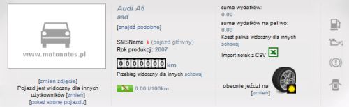 widoczność dla użytkowników - jeśli pojazd jest niewidoczny, oznacza to, że nikt obcy nie będzie miał możliwości wglądu w szczegóły tego pojazdu, jego statystyki spalania oraz pojazd nie będzie prezentowany w wyszukiwarce ani na stronach zbiorczych serwisu. W przypadku, gdy chcemy jedynie ukryć przebieg lub koszty, możemy użyć do tego celu linków "ukryj przebieg" i "schowaj".